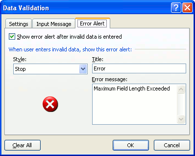 Next we clicked on the Error Alert tab. Since we do not want the user to enter a first name with more than twenty characters, in the Title field we entered the word Error, and in the Error message field, we entered the words Maximum field length exceeded.