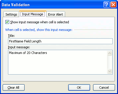 Now move to the Input Message tab. If you like, you may enter a message that will appear when you are entering data. Here we chose to enter a title and message that would remind the user of the maximum field length.